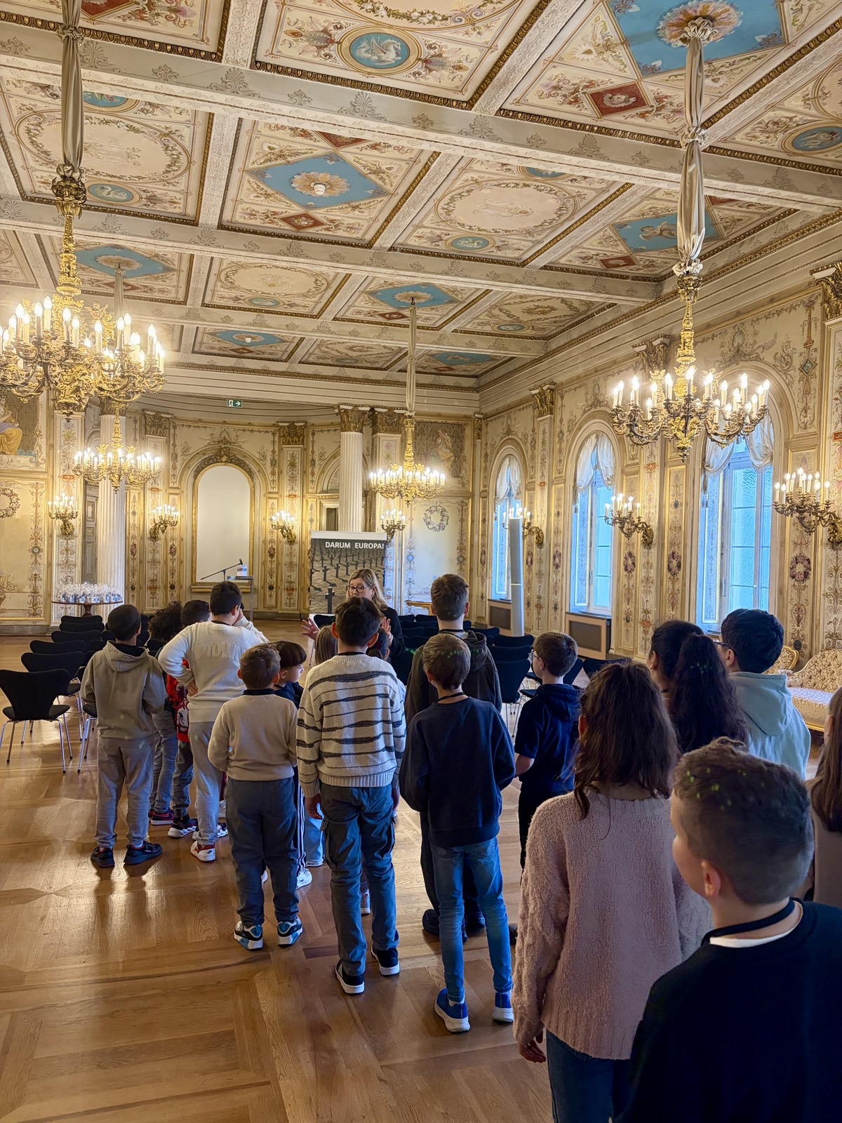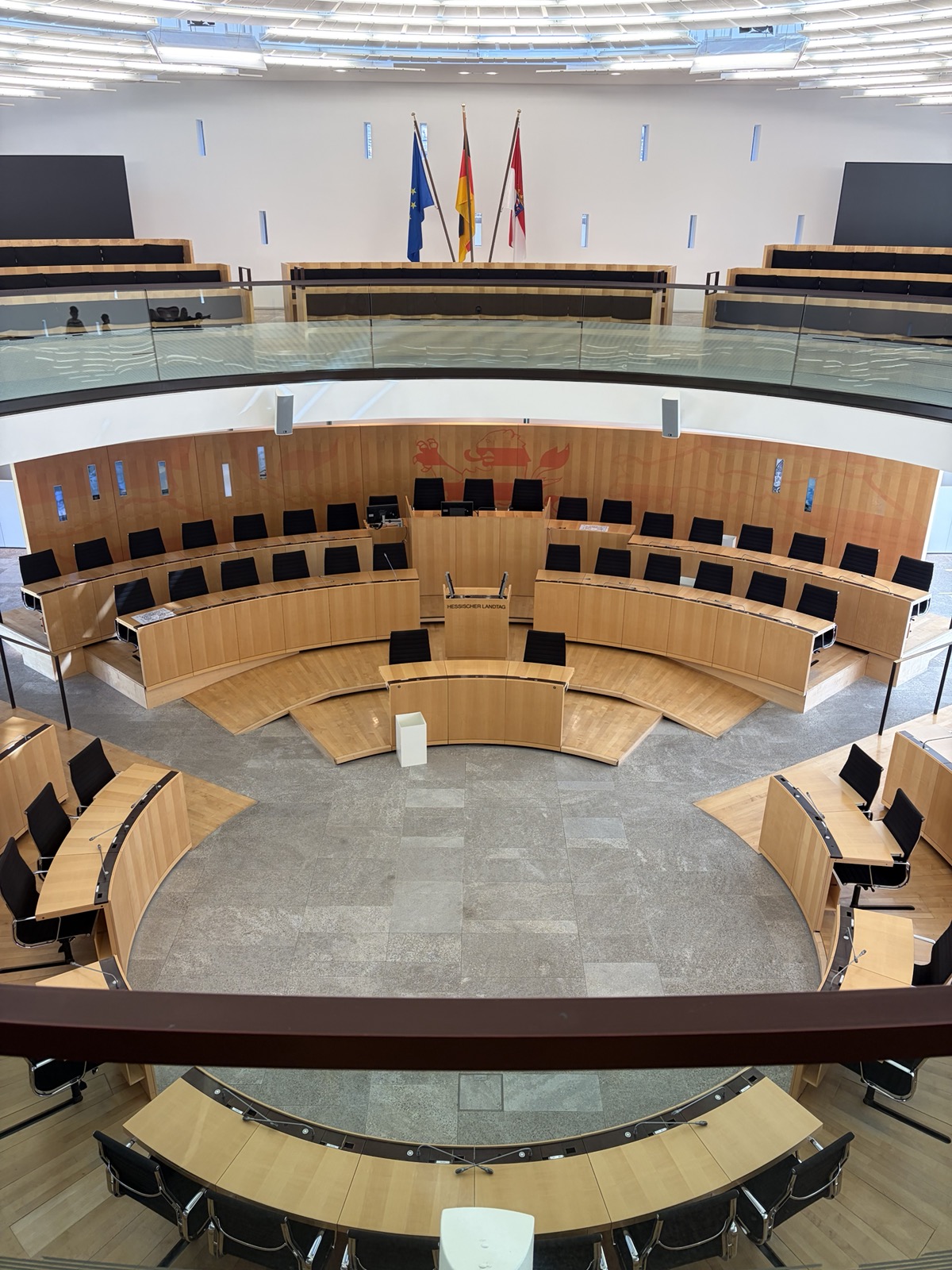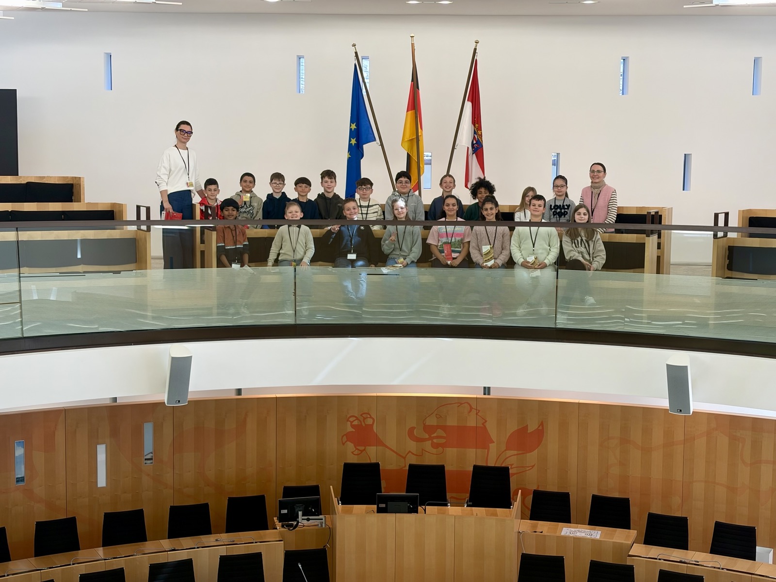 Das Schülerparlament der Grundschule Sauerland besuchte am 20.04.2026 den hessischen Landtag. Nach der Sicherheitskontrolle bekamen wir die außergewöhnliche Gelegenheit das Schloss im Landtag, das einst für die Herzöge von Nassau erbaut wurde, zu bewundern. Dies empfanden alle Kinder als imposant. Danach besprachen wir im Sitzkreis das Bundesland Hessen mit allen geografischen und kulturellen Besonderheiten. Den krönenden Abschluss bildete eine Besichtigung des Plenarsaals. Dort wurde viel über die einzelnen Parteien, Anzahl der Sitze und über den spannenden Beruf des Schriftführer erzählt. Zum Abschluss gab es für alle Kinder noch ein Pixi-Buch sowie einen kleinen Plüschlöwen. Zufrieden traten wir wieder die Rückfahrt zur Schule an.